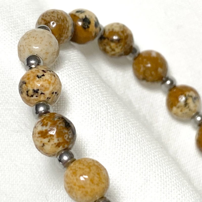 Realizzato con pietre dure naturali di diaspro giallo, con chiusura a moschettone e distanziatori in acciaio anallergico