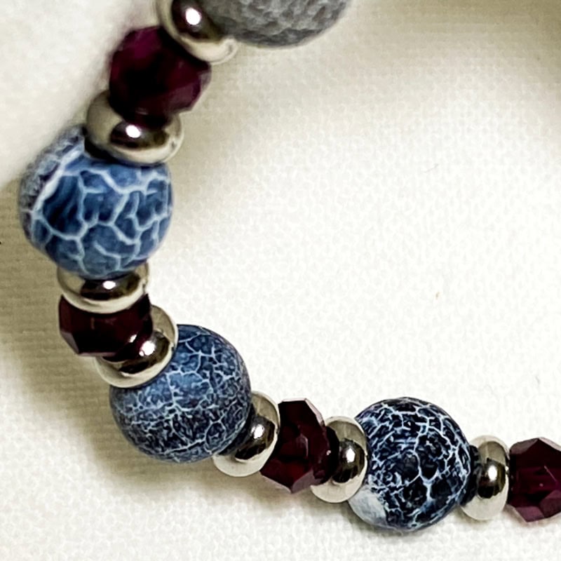 Il nostro bracciale è realizzato artigianalmente con pietre dure naturali di agata blu (non lucidate) e granato, con chiusura e distanziatori in acciaio inossidabile