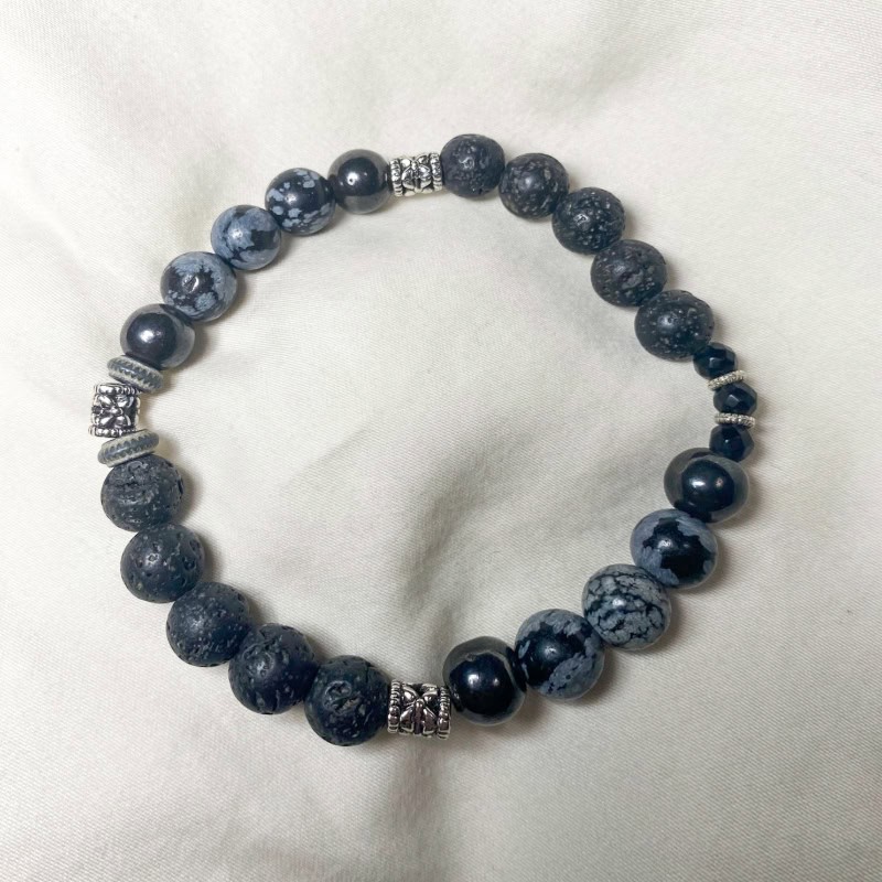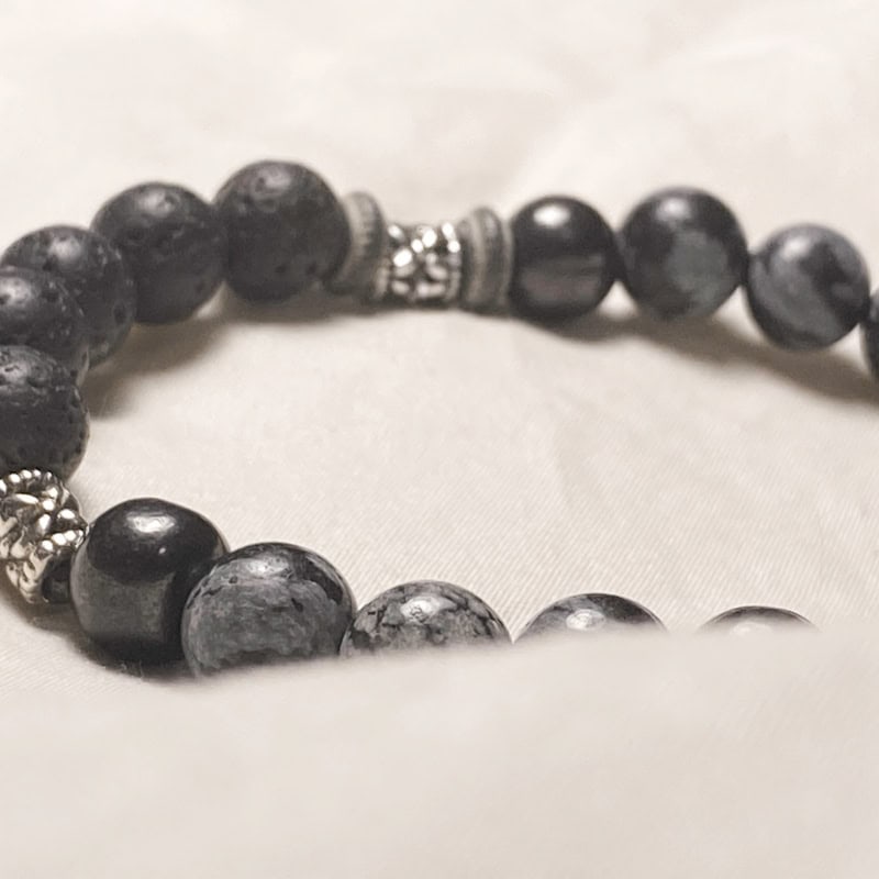 Realizzato con pietre naturali di ossidiana e pietra lavica, il bracciale si adatta bene al polso grazie al suo elastico morbido ma resistente e anallergico.